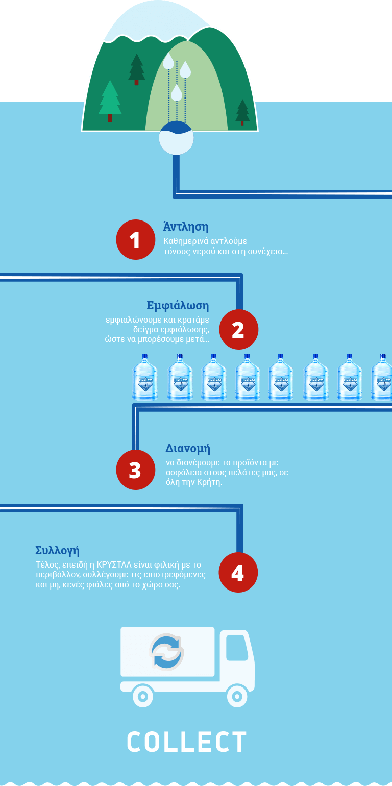 Η KRYSTAL Minoan Waters ακολουθεί ένα Σύστημα Ολοκληρωμένης Διαχείρισης το οποίο αποτελείται από την ΑΝΤΛΗΣΗ του νερού, τον ΕΛΕΓΧΟ και την ΕΜΦΙΑΛΩΣΗ του, τη ΔΙΑΝΟΜΗ στους πελάτες και τέλος τη ΣΥΛΛΟΓΗ των κενών φιαλών, διότι μία από τις βασικές προτεραιότητές μας είναι η ανακύκλωση συσκευασιών.